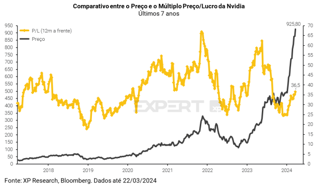 A semana foi marcada por uma série de notícia ligadas à temática de Inteligência Artificial (AI). No início da semana, a Nvidia realizou uma conferência para o lançamento de seu processador gráfico de próxima geração para inteligência artificial, chamado Blackwell, que terá um preço entre US$ 30 mil e US$ 40 mil por unidade. Essa faixa de preço para o chip, que provavelmente terá uma alta demanda para treinar e implantar software de IA, como o ChatGPT, é semelhante ao seu antecessor, o H100.