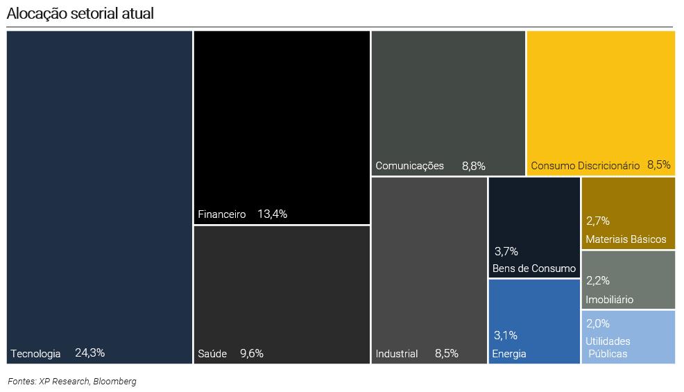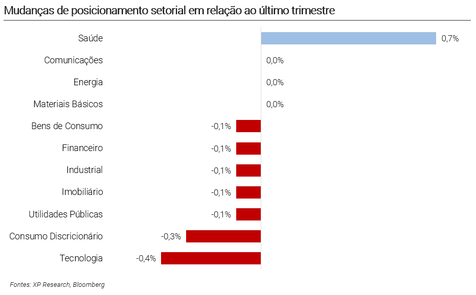 Por outro lado, o setor de Tecnologia registrou redução de participação no agregado, indicando alguma realização de lucros ou rebalanceamento após forte performance anterior. Junto a isso, vemos que o aumento dos temores de uma bolha ligada a inteligência artificial possa ter contribuído para redução da exposição ao setor. Embora continue representando parcela significativa dos portfólios institucionais, o ajuste no trimestre sugere uma postura ligeiramente mais cautelosa ou uma diversificação para outros segmentos.