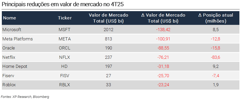 Entre as principais reduções, destacam-se cortes em Microsoft, Meta, Oracle e Netflix, além de diminuições em Home Depot e Fiserv. Dessa forma, fica evidente o caráter mais defensivo dos investidores institucionais durante o último trimestre de 2025, realizando lucros de tecnologia e aumentando exposição em Saúde.