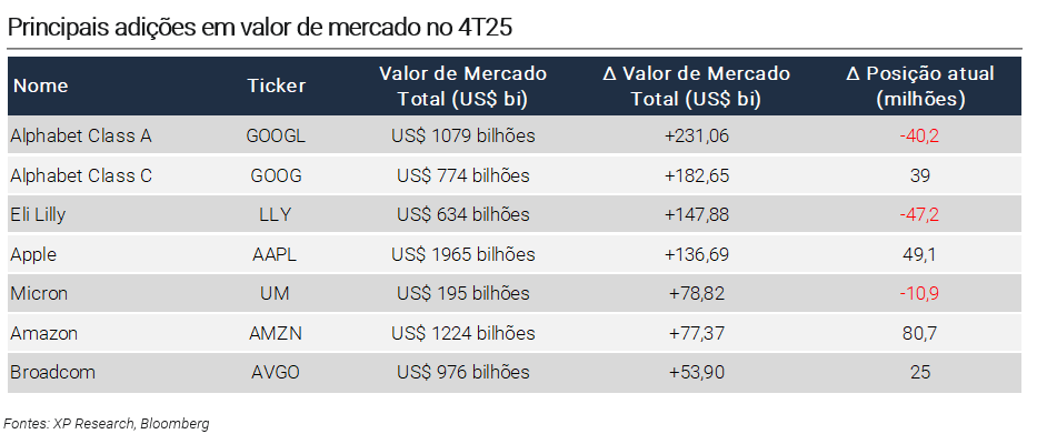Entre as maiores posições aumentadas, o trimestre foi marcado por compras relevantes em nomes como Alphabet e Eli Lilly, além de exposição adicional a ETFs amplos como o Vanguard S&P 500 ETF (VOO). Também chamam atenção aumentos em Apple, Micron e Broadcom, reforçando que, apesar da leve redução setorial em tecnologia no agregado, ocorreram compras seletivas em large caps.