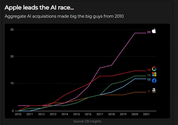 Robôs vão dominar o mundo? Na corrida pelo desenvolvimento de inteligência artificial, as FAAMGs apostam em aquisições. Apple e Google lideram o ranking, com 29 e 15 aquisições de empresas de IA respectivamente. A Apple, além de aprimorar seus produtos e serviços, desenvolveu seu primeiro chip proprietário M1, que promete uma performance de processamento até 3,5x superior relativo aos anteriores. Já o Google afirma ter desenvolvido um software com inteligência artificial capaz de criar o design de chips em menos de 6 horas, um trabalho que levaria meses para ser desenvolvido por humanos.