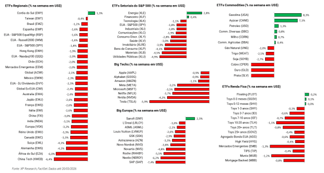 Nos mercados, a reação foi consistente e negativa. O S&P 500 caiu ao longo de todos os dias da semana, refletindo uma reprecificação contínua de risco em um ambiente de maior inflação esperada, disrupção de cadeias globais e incerteza geopolítica elevada. Enquanto não houver sinais concretos de normalização no Estreito de Ormuz ou de desescalada do conflito, a tendência é de manutenção desse ambiente mais volátil e desafiador para ativos de risco.