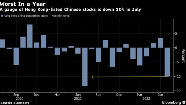 Índice chinês de ações caminha para o pior mês do ano: O gráfico acima, da Bloomberg, mostra que o índice de ações Hang Seng China Enterprises caiu 2,8% na sexta-feira, aumentando sua perda de julho para mais de 10%, seu pior desempenho mensal em um ano. As ações de tecnologia e do setor imobiliário lideraram a ampla venda depois que a falta de novos estímulos na reunião do Politburo da China deixou os mercados decepcionados. O índice Nasdaq Golden Dragon China caiu cerca de 4% na sexta-feira em Nova York, o que provavelmente levará o índice para o pior mês desde março. Sinais de uma nova repressão ao setor de tecnologia, um aumento da crise envolvendo incorporadoras imobiliárias, e nova alta nos casos de Covid-19, incentivaram essa queda em julho. A crise no setor imobiliário também se agravou este mês, à medida que mais compradores se revoltaram contra os pagamentos de hipotecas de casas inacabadas. Country Garden Holdings, a maior construtora da China, e Alibaba estão entre os piores desempenhos no indicador HSCEI este mês.