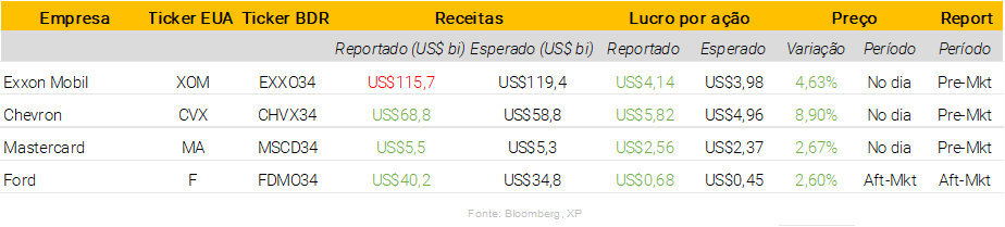 Exxon Mobil reporta lucro acima da expectativa e anuncia aumento de produção: A Exxon Mobil (NYSE: XOM, BDR: EXXO34) reportou uma receita de US$ 115,7 bilhões vs. US$ 119,4 bilhões projetados pelo mercado; o LPA foi de US$ 4,14 vs. US$ 3,98 esperados pelos analistas. Darren Woods, CEO da empresa, informou que os ganhos e o fluxo de caixa se beneficiaram do aumento da produção e do rígido controle de custos A Exxon se beneficiou de margens crescentes para produtos refinados como gasolina e diesel, que estão em falta desde a invasão da Ucrânia pela Rússia devido a sanções e falta de capacidade global de refino.
