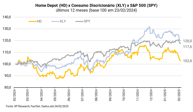 Para 2025, a Home Depot divulgou guidances abaixo do esperado, prevendo uma queda de -2% A/A no lucro por ação ajustado e um crescimento de aproximadamente +1% nas vendas em mesmas lojas, enquanto o mercado esperava +1,65%. A margem operacional também ficou abaixo das expectativas, com a empresa projetando cerca de 13%, enquanto o consenso estimava 13,7%.