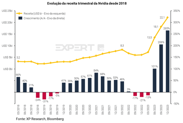 A Nvidia vê a receita em US$ 24bi (mais ou menos 2%) para o próximo trimestre, ante uma expectativa do mercado de US$ 21,9bi, e uma expansão de 77% em sua margem bruta (mais ou menos 50 pontos-base) ante uma expectativa de 75,5%. Os comentários do CEO acerca da expansão da demanda para cada vez mais empresas, setores e nações animaram o mercado, e as ações subiram 16,5% no pregão subsequente à divulgação de resultados. A alta de Nvidia desde o início do ano passado é motivada pelo otimismo com a temática de AI, que o mercado espera que gere ganhos de produtividade para as empresas e economia, à medida que seu uso vá se tornando mais acessível e seus resultados mais refinados.