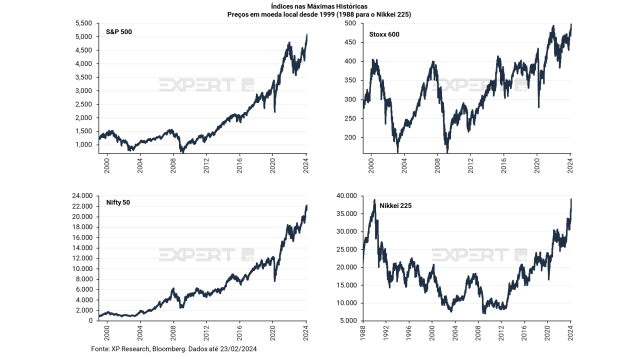 1. Mercados Globais nas Máximas Históricas: Otimismo contagia múltiplas regiões – S&P 500, Stoxx 600, Nifty 50 e Nikkei 225 atingem máximas