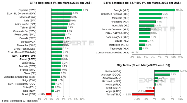 Digno de nota, também, foi a rotação na liderança das performances ao longo de março, mostrando um “contágio” do otimismo visto nos temas predominantes nos últimos meses (AI, Big Techs, GLP-1). Regionalmente, mercados na Europa e alguns emergentes como México, África do Sul e Coréia do Sul tiveram valorizações acima do ACWI e do S&P 500. Já nos EUA, temas como dividendos e small caps e setores cíclicos como energia e materiais básicos, além de utilidades públicas de destacaram do lado positivo, enquanto os três setores que englobam as empresas de tecnologia (consumo discricionário, comunicações e tecnologia) ficaram aquém do S&P 500 no mês.