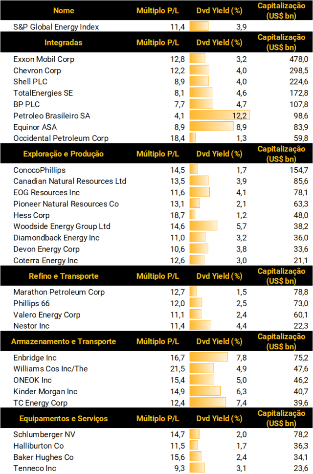 Desde o início do ano, o setor de energia tem tido o melhor desempenho do índice S&P 500 (XLE: +16,7% vs. SPY: 8,3%), impulsionado pelo desempenho de empresas ligadas ao petróleo. Atualmente, o setor representa cerca de 4% do peso do índice, muito aquém do que já chegou a representar no passado (atingiu 16% em 2008), e consideravelmente abaixo dos 30% de tecnologia, que domina a Bolsa americana nos anos 2020.