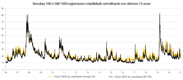 E mesmo com a grande exposição que o Nasdaq-100® possui em Tecnologia e maiores retornos no índice em relação ao S&P 500, a volatilidade histórica de ambos os índices foi muito semelhante durante o mesmo período.