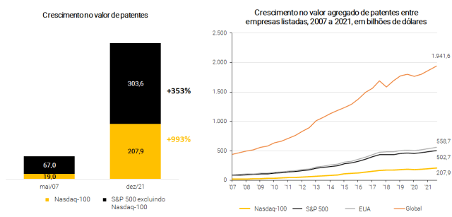 Quando se trata de crescimento de ativos intangíveis, as empresas que atualmente compõem o Nasdaq-100® aumentaram o valor de suas patentes em quase dez vezes desde maio de 2007, contra ao redor de 3,4 vezes em todas as empresas listadas em todo o mundo. O crescimento geral do S&P 500 foi de quase cinco vezes, mas, excluindo a contribuição das empresas que fazem parte de ambos os índices, o crescimento fica apenas em cerca de 5,5x. O crescimento global excluindo os EUA foi de apenas 3x. Além disso, 62 empresas do Nasdaq-100® (representando 85,6% do peso do índice) recentemente registraram patentes em uma ou mais das 35 principais áreas de Tecnologia Disruptiva, como Inteligência Artificial, Energia Limpa ou Blockchain.