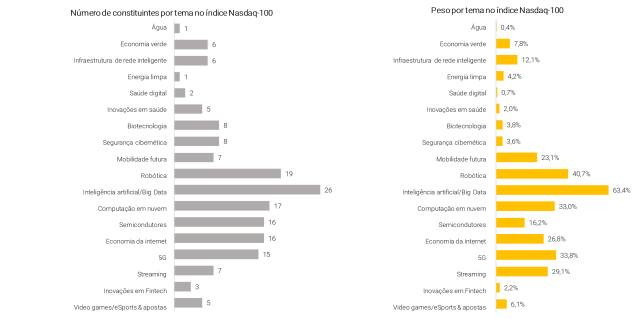 Outro fator extremamente atrativo no Nasdaq-100® é a presença de empresas mais inovadoras no índice, incluindo maior exposição a temas de crescimento estrutural de longo prazo como energia verde, biotecnologia, segurança cibernética, entre outros.