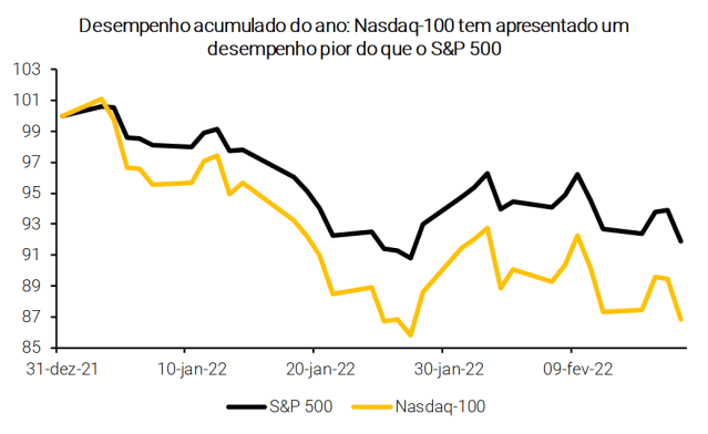 Em outras palavras, quando as taxas sobem, esses ganhos futuros tornam-se menos valiosos no dinheiro de hoje. E como o Nasdaq-100® é um índice que tem maior peso em empresas de tecnologia (de crescimento) do que o S&P 500, ele vem sofrendo mais com o aumento dos rendimentos dos títulos do Tesouro.