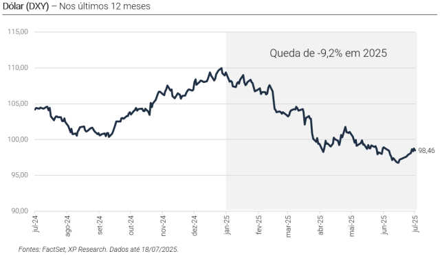 Apesar dos possíveis efeitos decorrentes das tarifas, que tendem a pressionar a lucratividade das companhias, a desvalorização do dólar ao longo do trimestre deve ajudar a mitigar parte desse impacto, principalmente no caso de empresas com maior exposição internacional.