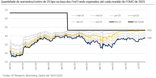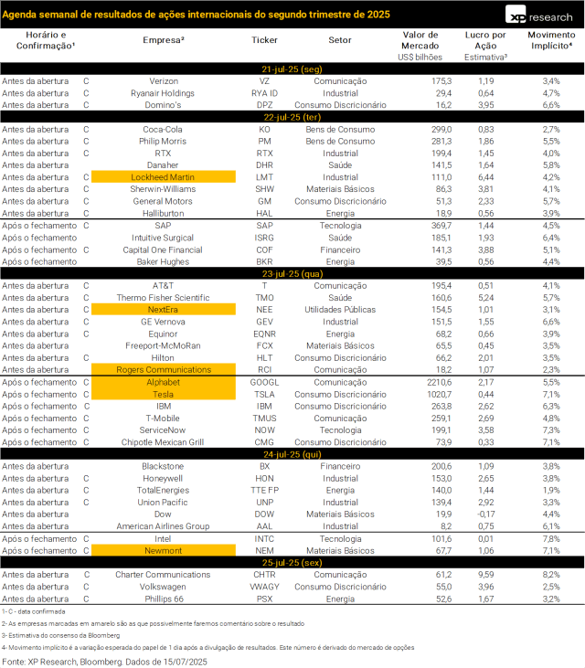 A próxima semana será marcada por uma série de dados de atividade e moradia nos EUA, incluindo os PMIs preliminares de julho (quinta-feira), as vendas de casas existentes (quarta) e novas (quinta), além de pedidos de bens duráveis (sexta). O Fed inicia seu período de silêncio antes da decisão do FOMC de 30 de julho, para a qual o mercado segue esperando manutenção da taxa, mas com crescente atenção a um possível corte em setembro, e diante de fortes ruídos políticos envolvendo a instituição. Na terça-feira (22), o presidente Jerome Powell participa de uma conferência do setor bancário. O destaque da semana segue sendo a temporada de resultados do 2T25, que entra em sua fase mais intensa com a divulgação de balanços de empresas como Tesla, Google, IBM, LVMH e Volkswagen. Como comentamos em nossa prévia, esperamos surpresa positiva no crescimento do lucro por ação nos resultados. Na Europa, o foco recai sobre a decisão do BCE na quinta-feira, com expectativa de manutenção dos juros. As negociações comerciais entre EUA e União Europeia também seguem no radar, com avanços discretos em meio às tensões tarifárias.