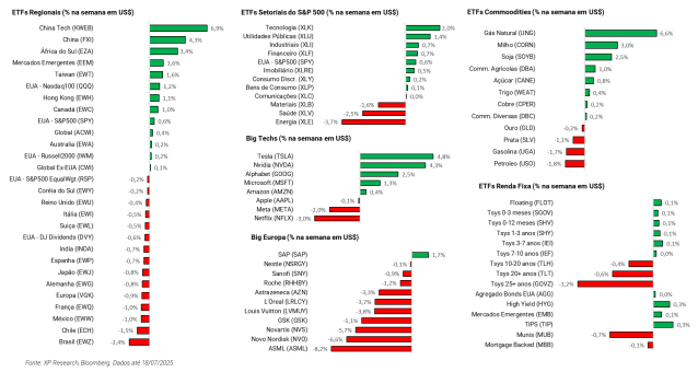 A semana foi novamente marcada por ameaças de tarifas por Donald Trump. Após anúncio de tarifas mais elevadas para 23 países, o foco foram negociações com a União Europeia, que ameaçou retaliações contra empresas americanas, inclusive sobre serviços.