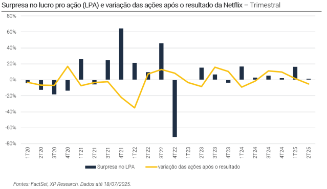 Em nossa Prévia da temporada de resultados do 2T25 nos EUA: Desafiando o ceticismo havíamos antecipado que o dólar mais fraco poderia favorecer o lucro de companhias com exposição a receita gerada fora dos EUA, o que não necessariamente constituiria um fator positivo para o preço das ações. As ações da Netflix foram penalizadas após a divulgação do resultado, apresentando queda de -5,1% no pregão seguinte, em reação à distorção provocada pelo câmbio nos resultados e diante da sinalização de queda na margem operacional para o próximo trimestre. Leia aqui mais detalhes sobre a divulgação de resultados de Netflix.