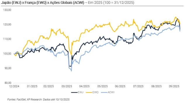 Por fim, Japão e França caminham em direções distintas, mas com um ponto em comum: a política se tornou o principal fator de preço. No país asiático, a nova liderança reforça o viés de estímulo, com um iene fraco e apoio às exportadoras. Já na França, o foco é fiscal e político, e o risco é o tempo que o país levará para reconstruir a confiança dos investidores.
