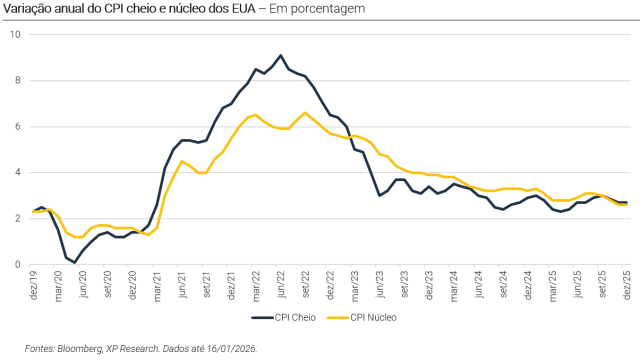 A leitura mais recente da inflação americana trouxe algum alívio na margem: núcleo do CPI avançou 0,2% em dezembro em 2,6% em termos anuais, ambos 0,1 pp abaixo das expectativas, enquanto o índice cheio subiu 0,3% no mês e 2,7% em 12 meses, exatamente em linha com o consenso. No entanto, o dado ainda não oferece conforto pleno ao Federal Reserve, uma vez que apesar de seguir se moderando, a inflação permanece acima da meta de 2% do Fed. A reação inicial do mercado foi com leve alta dos futuros no mercado de ações e queda dos Treasuries, mas sem alterar o cenário base. Os investidores seguem apostando que o Fed manterá os juros inalterados na reunião deste mês, com o próximo corte sendo considerado apenas a partir de junho.