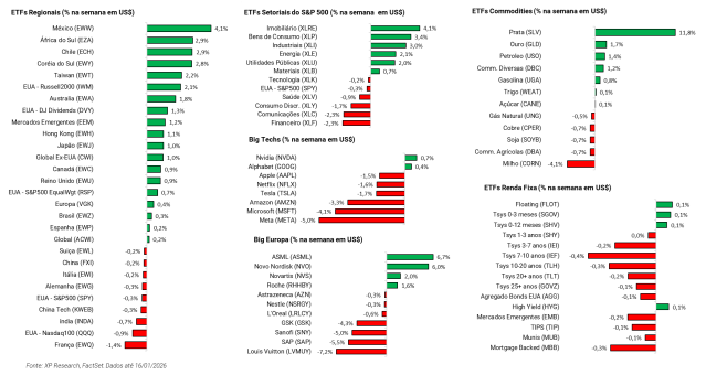 Apesar do ruído político, os mercados têm apresentado resiliência. As taxas de curto prazo apresentaram leve alta desde os episódios recentes (2 anos: +5 bps na semana), sugerindo que investidores seguem confiantes de que a função de reação do Fed permanece intacta (pelo menos por enquanto). Essa leitura é reforçada pela redução nas expectativas de corte em 2026 durante a semana, representando um cenário de reação mais dura dos membros do Fed diante temores de que a independência do banco central possa ser comprometida por intervenções do governo e a partir do apontamento de um novo presidente do Federal Reserve por Trump, que deverá assumir em maio. Ainda assim, o episódio reabre o debate sensível que, mesmo sem efeitos imediatos sobre preços ou ativos, a pressão política constante sobre o banco central adiciona uma capa de incerteza à condução da política monetária em um momento em que a inflação, embora mais contida, ainda não permita complacência.