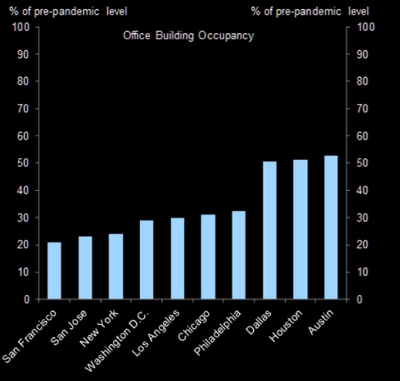 Trabalho presencial vs. novo normal: O gráfico acima apresenta dados sobre a ocupação dos escritórios em grandes cidades americanas, que ainda permanecem significantemente abaixo dos níveis pré-pandemia. Os destaques positivos vão para Austin, Houston e Dallas com uma ocupação próxima a 50% vs. período pré-pandêmico. Por outro lado, grandes e populosas cidades como São Francisco, San Jose e Nova Iorque ainda possuem ocupações em torno de 20%-25%. De acordo com o Google, o percentual de pessoas visitando os escritórios para trabalhar ainda está, em geral, ~-27% inferior aos níveis vistos em 2019. Os dados reforçam a mensagem do “novo normal”, sugerindo que os sistemas híbridos e remotos de trabalho serão, de fato, implementados por um longo período. Fazendo um comparativo com dados da Mckinsey, a ocupação de escritórios nos EUA está menor do que o índice de mobilidade apresentado no mundo, que atualmente se encontra em -20% vs. pré-pandemia, dando indícios que a ocupação de escritórios e ambientes de trabalho nos EUA não se recuperam ao passo da reabertura global, mesmo em um país com estágio avançado de vacinação.