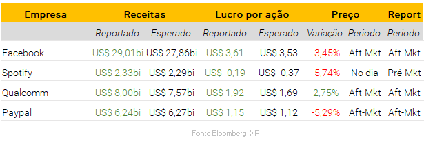 Facebook surpreende, mas o futuro desanima: A gigante das redes socias divulgou seus resultados após o fechamento do mercado, com uma receita de US$ 29,08bi vs. US$ 27.86bi esperados pelo consenso, uma diferença de +4,37%; o lucro líquido da companhia também foi em linha com as projeções de analistas foi de US$ 10,39bi vs. US$ 10,21, gerando um LPA de US$ 3,61. Apesar de anunciar um resultado sólido, com uma surpresa na receita média por usuário de US$ 10,12 vs. US$ 9,66 das projeções, o Facebook comentou que espera uma desaceleração em crescimento nos próximos trimestres. Após divulgação do guidance, investidores reagiram negativamente e a ação caiu -3,45% no período pós mercado. Parte desta queda, pode também ser atribuída a uma quebra de altas expectativas por parte dos investidores que estavam otimistas com o Facebook após o forte resultado reportado pelo Twitter (a ovelha negra das redes sociais, em termos de monetização).