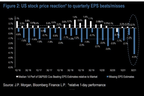 Resultados abaixo do consenso sofrem a maior queda desde 2016: O gráfico acima apresenta o histórico da performance das ações que estão reportando seus lucros acima ou abaixo das expectativas do mercado em neste 3T21. Em branco temos performance das ações que divulgaram resultados superiores as expectativas, as quais, na média, performaram +0,1% no dia. No entanto, para as ações que estão surpreendendo negativamente, houve uma queda na média de -4,3% em suas ações, a reação mais negativa desde o primeiro trimestre de 2016, sugerindo que o mercado está com um sentimento “punitivo” para as empresas que não estão apresentando bons números. Possíveis explicações para esta postura dos investidores são i) o crescimento abaixo do esperado, visto que a base de comparação com o 3T20 é baixa para alguns setores, ii) Companhias fornecendo guidances negativos ao passo que a crise global dos chips e escassez de componentes afetam os seus negócios, iii) cenário macro desfavorável com temores relacionados à inflação. A advertência é que ainda estamos no início da temporada (~30% reportaram nos EUA) e muitas vezes a tendência inicial se inverte, mas ainda assim, é um sinal de alerta.