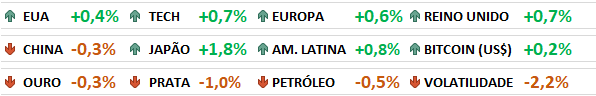Mercados globais estendem ganhos nesta manhã (EUA +0,4% e Europa +0,6%) puxados por empresas de tecnologia (Nasdaq 100 +0,7%) após recente rali da Tesla, que ultrapassou o valor de mercado do Facebook e alcançou US$ 1tri de market cap. Os fortes números da rede social, bem como um anúncio de US$ 50bi em recompras também estimularam a alta. Na China (-0,3%) gov. ordena que fundador da Evergrande utilize seu patrimônio pessoal para quitar dívidas da companhia. O Bitcoin (+0,2%) desacelera seu ritmo de alta à medida que mercados aguardam relatório das autoridades monetárias americanas sobre novas regulações dos criptoativos.