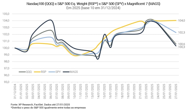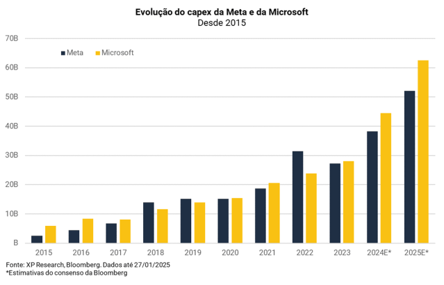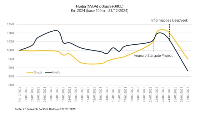 Embora nos últimos trimestres diversas empresas tenham sinalizado aumentos em seus guidances de capex para infraestrutura habilitada para inteligência artificial, como o anúncio de que a Microsoft espera gastar cerca de US$ 80 bilhões ao longo do ano fiscal de 2025, os retornos ainda não são completamente visíveis. Somada à desconfiança do mercado quanto à magnitude do capex, a informação de que a DeepSeek está conseguindo desenvolver um modelo similar às empresas americanas gastando uma fração de seu investimento acende um sinal de alerta quanto à eficiencia do atual modelo de investimento em AI.