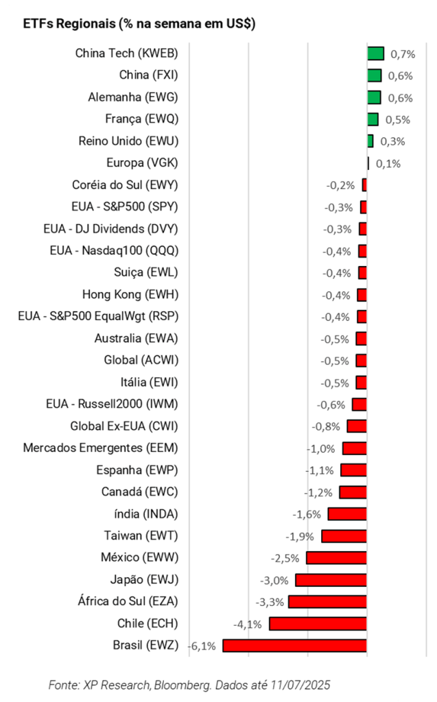 A semana foi marcada por anúncio de novas tarifas por Donald Trump, tanto sobre uma série de países quanto sobre produtos específicos, na semana em que encerrou o prazo de 90 dias para adiamento das tarifas do Liberation Day. No fim de semana, o secretário do Tesouro dos EUA, Scott Bessent, anunciou a retomada das tarifas a partir de 1º de agosto, o que foi seguido por pronunciamento de Trump, ameaçando tarifas para membros dos BRICS e países que se alinharem ao bloco, na semana em que ocorreu a cúpula dos BRICS no Rio de Janeiro.