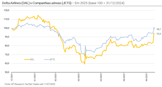 Após a divulgação de resultados do 2T25, as ações de Delta Airlines (ticker: DAL) avançaram cerca de 12%, refletindo expectativa de recuperação das viagens, refletida no guidance da companhia para o próximo trimestre, para o qual projeta crescimento de receita entre 0% e 4%.
