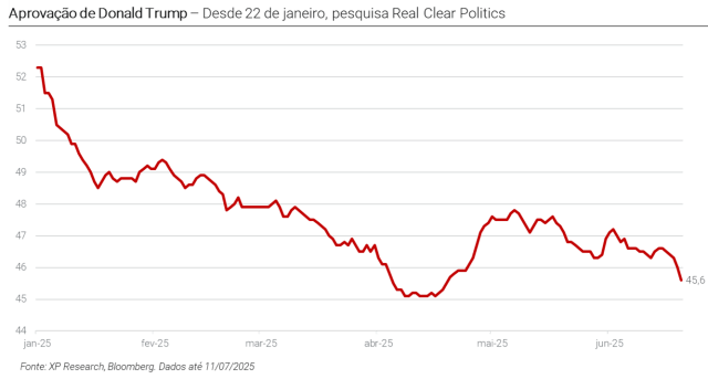 - Quinta-feira (10 de julho): Anúncio de tarifa de 35% sobre importações do Canadá, o que foi uma surpresa e sinal de reescalada do conflito comercial com um dos principais parceiros regionais dos EUA, conflito este que já parecia pacificado.