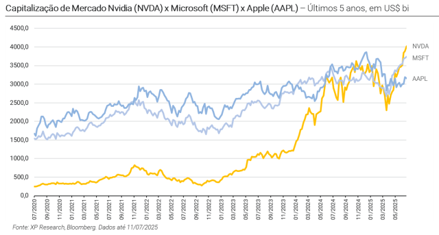 Na quarta-feira, dia 9 de julho, Nvidia (ticker: NVDA) se tornou a primeira companhia a atingir US$ 4 tri em capitalização de mercado, ultrapassando o recorde anterior, detido pela Apple.