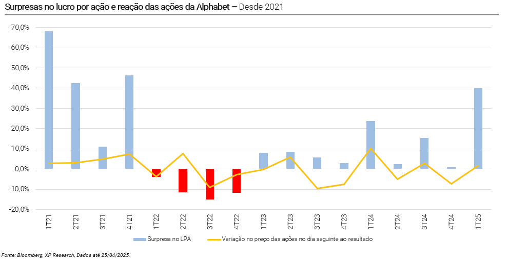 Já a Alphabet (Ticker: GOOG) surpreendeu positivamente, com alta de +12% na receita e de +49% no lucro por ação ajustado A/A, ambos acima das expectativas. O bom desempenho veio principalmente da resiliência do mercado de publicidade digital, que cresceu +8,5% A/A mesmo diante das preocupações macroeconômicas. Embora a divisão de nuvem tenha ficado ligeiramente abaixo das estimativas, a margem do Google Cloud subiu para 17,8%, reforçando a melhoria de rentabilidade.
