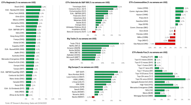 Apesar da reação negativa das empresas, as companhias tiveram bom desempenho na semana. As ações da Meta (Ticker: META) subiram +9,1% na semana, enquanto as da Apple (Ticker: AAPL) avançaram +6,2%, devido ao movimento positivo do mercado pela expectativa de desescalada da guerra comercial, como falamos no tema #2. O acontecimento reforça o risco crescente de mudanças estruturais no modelo de negócios das Big Techs em território europeu.