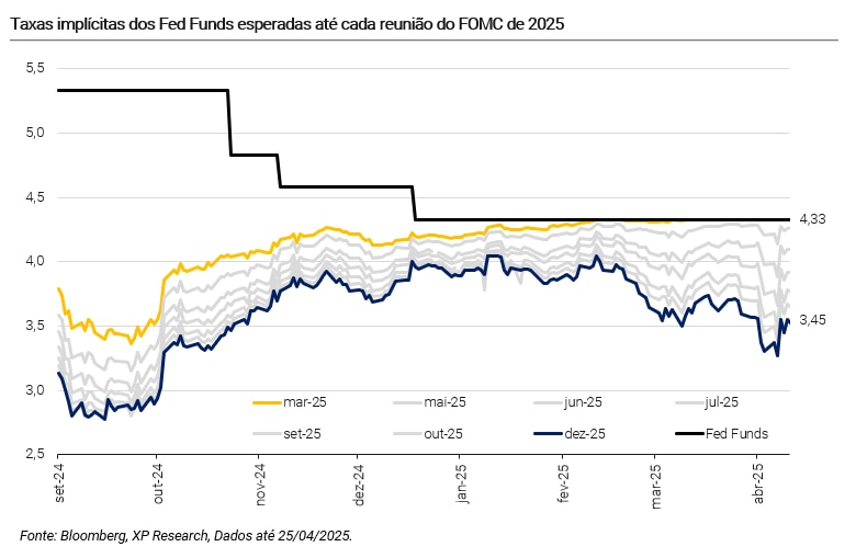 A postura de Trump em relação a Powell reflete sua preocupação impulsionar o crescimento econômico em meio às incertezas comerciais e à fragilidade da confiança empresarial. Por outro lado, Powell reafirmou que decisões sobre juros seguirão sendo tomadas com base em dados e sem interferência política, rejeitando pressões internas. Com isso, a curva de juros fechou essa semana, com a taxa dos títulos de 10 anos recuando 8 bps e a de 2 anos caindo 5 bps. Por fim, com as atenções voltadas para a reunião de política monetária em maio, o mercado segue monitorando o duplo movimento da Casa branca: de um lado, buscando distensionar relações comerciais; de outro, pressionando a autoridade monetária a agir em favor da atividade doméstica. O mercado espera uma manutenção da taxa de juros no intervalo de 4,25% a 4,50% na próxima reunião, porém estima 4 cortes até o final do ano.