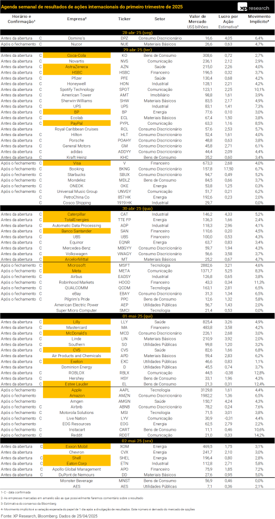 Essa semana, a Tesla e a Alphabet foram a 2ª e a 3ª entre as Big Techs a reportar os resultados, e semana que vem teremos os números da Microsoft e da Meta na quarta-feira e da Apple e da Amazon na quinta-feira. Nossa expectativa é de que a desvalorização do dólar ao longo do trimestre (queda de cerca de -3,9% no DXY) exerça um impacto marginalmente positivo nos resultados. Ao todo, teremos cerca de 41% da capitalização do mercado divulgando seus relatórios trimestrais na semana que vem e cerca de 8,5% daqui duas semanas.