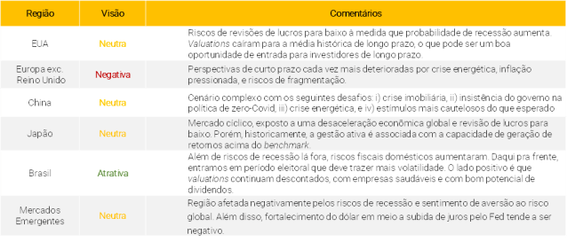 O segundo trimestre chinês foi marcado por restrições com os lockdowns contra a Covid-19 e uma forte desaceleração econômica. Na temporada de resultados, apenas 25% das empresas do MSCI China superaram as expectativas, e a decepção agregada nos lucros ficou na casa de -5%. O crescimento dos lucros permaneceu resiliente, saltando 7,9% no agregado vs. o mesmo período do ano anterior. Daqui para frente, o segundo semestre segue com desafios importantes no radar como: i) crise imobiliária, ii) insistência do governo na política zero-covid, iii) crise energética e iv) estímulos mais cautelosos que o esperado. Em virtude da deterioração macroeconômica chinesa, estamos revisando nossa visão de atrativa para neutra na região. Entretanto, ressaltamos que, apesar dos riscos, o momento diferente do ciclo econômico em que o país se encontra vs. outras regiões trás um efeito de diversificação para as carteiras dos investidores no cenário atual.