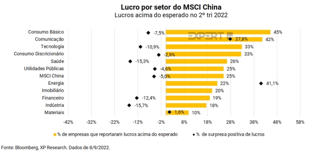 Dentre os setores, o maior destaque fica com as empresas de consumo básico, com 45% das empresas reportando acima do esperado, seguido pelos setores de Comunicação (42%) e Tecnologia (33%).