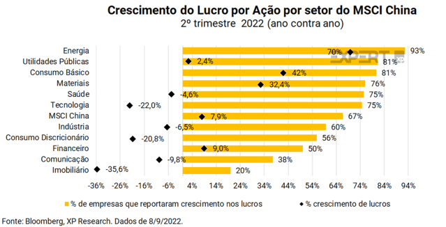 Notamos que os setores que conquistaram o maior crescimento de lucros estão correlacionados com fatores externos a economia chinesa, como a alta no preço das commodities que impulsionou tanto os lucros do setor de energia quanto materiais.