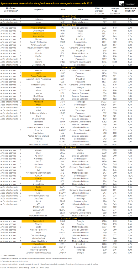 A última semana de julho promete ser uma das mais movimentadas do ano, com destaque absoluto para a decisão de política monetária do FOMC na quarta-feira (30), seguida da coletiva de imprensa de Jerome Powell. A expectativa do mercado é de manutenção dos juros, mas o foco estará na sinalização futura, especialmente em meio a dados que indicam crescimento sólido e inflação persistente. Na mesma manhã, será divulgado o PIB do 2T25, que deve mostrar recuperação após a contração no 1T25. Na quinta-feira (31), a atenção se volta para os dados de inflação via PCE, com expectativa de leve aceleração. A sexta-feira (1º de agosto) será dominada pelo payroll, com previsão de desaceleração na criação de vagas e atenção redobrada para a taxa de desemprego e os salários. Também serão publicados os PMIs industriais (S&P e ISM). Na frente internacional, o mercado monitora os PMIs da China e decisões do BoC, BOJ e BCE, enquanto o início das novas tarifas impostas por Trump no dia 1º de agosto adiciona tensão geopolítica à semana. Na temporada de resultados, a agenda está carregada, com destaque para Apple, Amazon, Meta, Microsoft, Chevron, ExxonMobil e Mastercard.