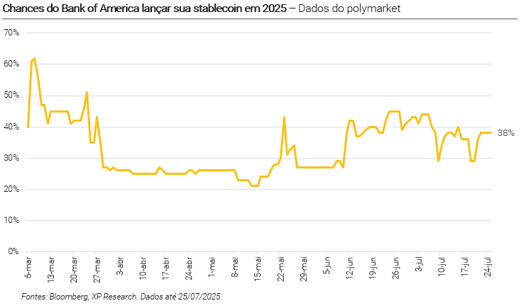Na última sexta-feira, Trump sancionou o GENIUS Act, primeira legislação federal dos EUA voltada exclusivamente para a regulamentação de stablecoins. A medida exige que esses ativos sejam totalmente lastreados por reservas líquidas, como dólares ou Treasuries de curto prazo, e representa um marco para a adoção das stablecoins como instrumento de pagamento no cotidiano. Com valor estável atrelado ao dólar, esse tipo de criptoativo viabilizaria transferências instantâneas e de baixo custo. A expectativa do mercado é de que o setor ultrapasse US$ 2 trilhões até 2028.