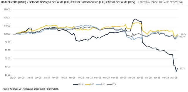 A pressão sobre o setor não está contida apenas entre as farmacêuticas, e se intensificou com notícias da UnitedHealth. A abrupta saída do CEO Andrew Witty por “motivos pessoais” e a revelação de uma investigação federal sobre fraudes no Medicare jogaram a maior seguradora de saúde dos EUA em uma crise sem precedentes. A ação da companhia já perdeu mais da metade do valor em um mês, e o retorno do ex-CEO Stephen Hemsley ao comando sinaliza a dimensão dos desafios enfrentados. A companhia também suspendeu seu guidance para 2025 e sinalizou que espera custos médicos mais elevados que o consenso.
