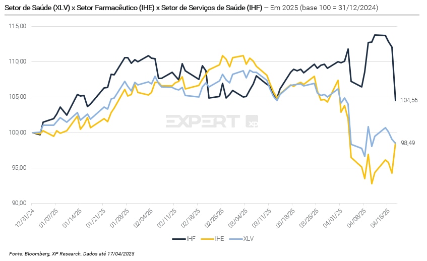 Os movimentos dos ETFs ao longo da semana ilustram bem a divisão dentro do setor de saúde. Enquanto o ETF de farmacêuticas (Ticker: IHE) subiu +4,5% na semana, o ETF de serviços de saúde (Ticker: IHF), que contempla a área de atuação da UNH, caiu -8,1% na semana e -6,7% no dia do resultado da companhia. Enquanto isso, o XLV, que representa o setor como um todo, recuou -0,4% na semana e -0,6% no dia da divulgação dos resultados da UnitedHealth, suavizando os extremos.