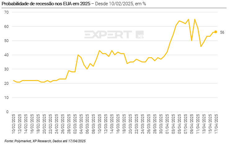 Por fim, apesar de alguns dados positivos para a economia americana divulgados ao longo da semana, como o avanço de 1,4% nas vendas no varejo em março, puxado principalmente pela corrida para comprar automóveis antes de potenciais aumentos de preços, os dados econômicos da semana foram interpretados como pouco relevantes diante do cenário atual. A produção industrial veio fraca, e Jerome Powell, presidente do Fed, alertou que as tarifas anunciadas são “significativamente maiores que o esperado”, e devem ter como efeitos aumento da inflação e desaceleração do crescimento. Com isso, os riscos de recessão voltaram a subir: segundo o Polymarket, a probabilidade de recessão nos EUA em 2025 já alcança 56%.