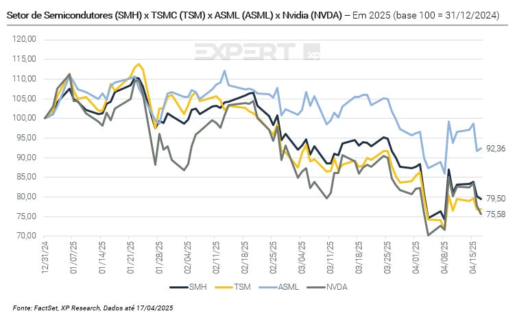 O mercado reagiu mal ao anúncio, evidenciando a alta exposição das companhias à dinâmica regulatória dos EUA. As ações da Nvidia encerraram a semana em queda de -8,5%, enquanto a AMD, que também foi impactada pelas restrições, caiu -6,3%. Esse movimento provocou uma queda de -2,7% no setor de tecnologia (ticker: XLK) e de -0,8% no de semicondutores (ticker: SMH) durante a semana.