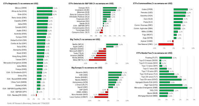 Por conta dessas incertezas, o S&P 500 (Ticker: SPY) teve alta de apenas +0,3% e o Nasdaq (Ticker : QQQ) queda de -0,5% na semana, sendo essas as piores performances. Esses desempenhos puxaram o ACWI (Ticker: ACWI) pra baixo, que subiu +2,0%. Com exceção do Nasdaq 100, todas as regiões apresentaram desempenho positivo.