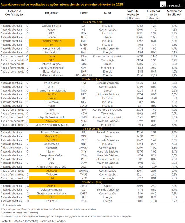 Essa semana, a Netflix foi a primeira entre as Big Techs a reportar os resultados, e semana que vem teremos os números de Tesla (terça-feira) e Alphabet (quinta-feira). Nossa expectativa é de que a desvalorização do dólar ao longo do trimestre (queda de cerca de -3,9% no DXY) exerça um impacto marginalmente positivo nos resultados. Ao todo, teremos cerca de 21,4% da capitalização do mercado divulgando seus relatórios trimestrais na semana que vem e cerca de 41,0% daqui duas semanas, com ajuda de Apple, Amazon, Meta e Microsoft.