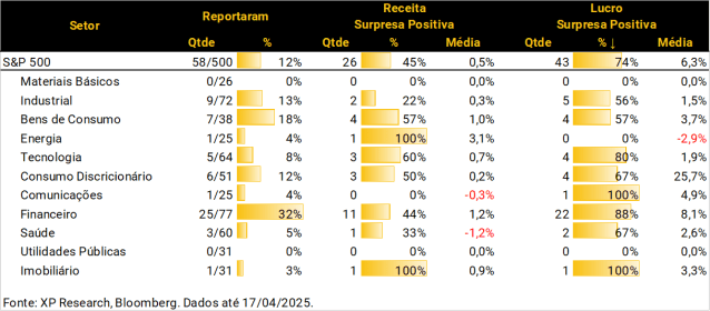Com 32% (25 em 77) das empresas do setor já tendo reportado seus resultados, o setor se destaca positivamente pela alta magnitude na surpresa do lucro por ação (LPA) (+8,1%), todos os grandes bancos já tendo divulgado. Os números foram impulsionados, principalmente, pelos bons resultados do Morgan Stanley (surpresa de +18,0% no LPA), Goldman Sachs (surpresa de +15,2% no LPA) e Bank of America (surpresa de +10,4% no LPA). Confira mais sobre os resultados no setor: