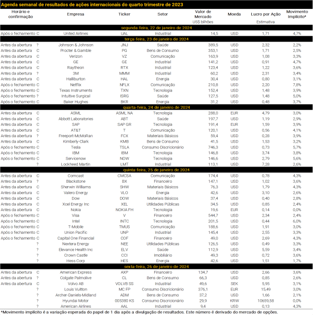 Na sexta-feira, dia 12/01, a temporada de resultados teve seu início extra-oficial com a divulgação dos resultados dos grandes bancos americanos. Nesta semana, tivemos uma semana tivemos poucas empresas divulgando resultados, com destaque para os bancos de investimentos Goldman Sachs e Morgan Stanley, diversos bancos regionais, como o US Bancorp, além da taiwanesa TSMC, que apesar de não ser americana, tem importância global por sua posição essencial na cadeia de suprimentos de semicondutores.